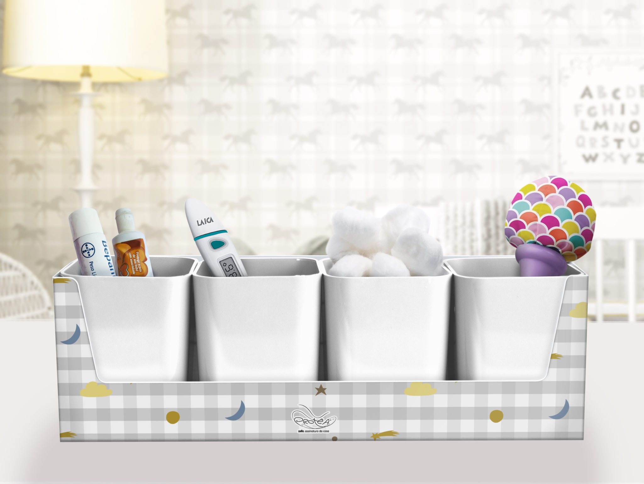 A fofura chegou da forma mais elegante possível. O kit Pequenos Astros vem com 4 porta objetos brancos em uma base estampada que une a atual tendência do xadrez em uma viagem por um céu de fofura.
